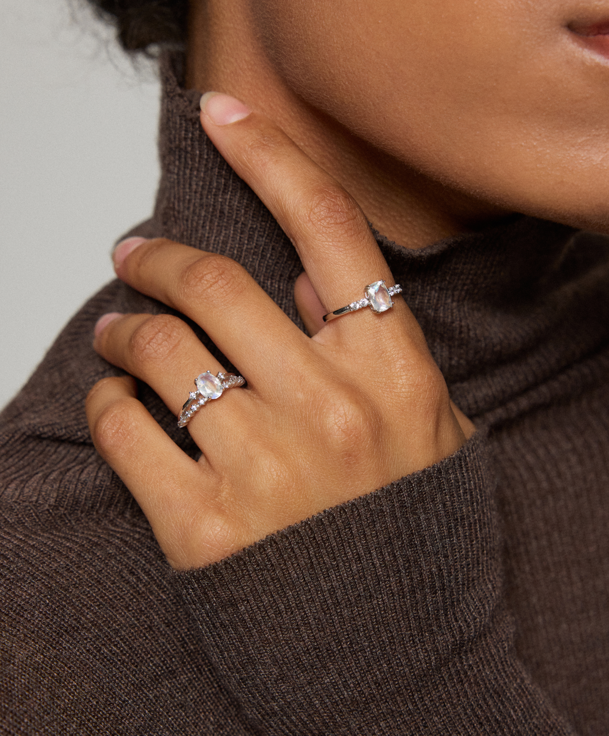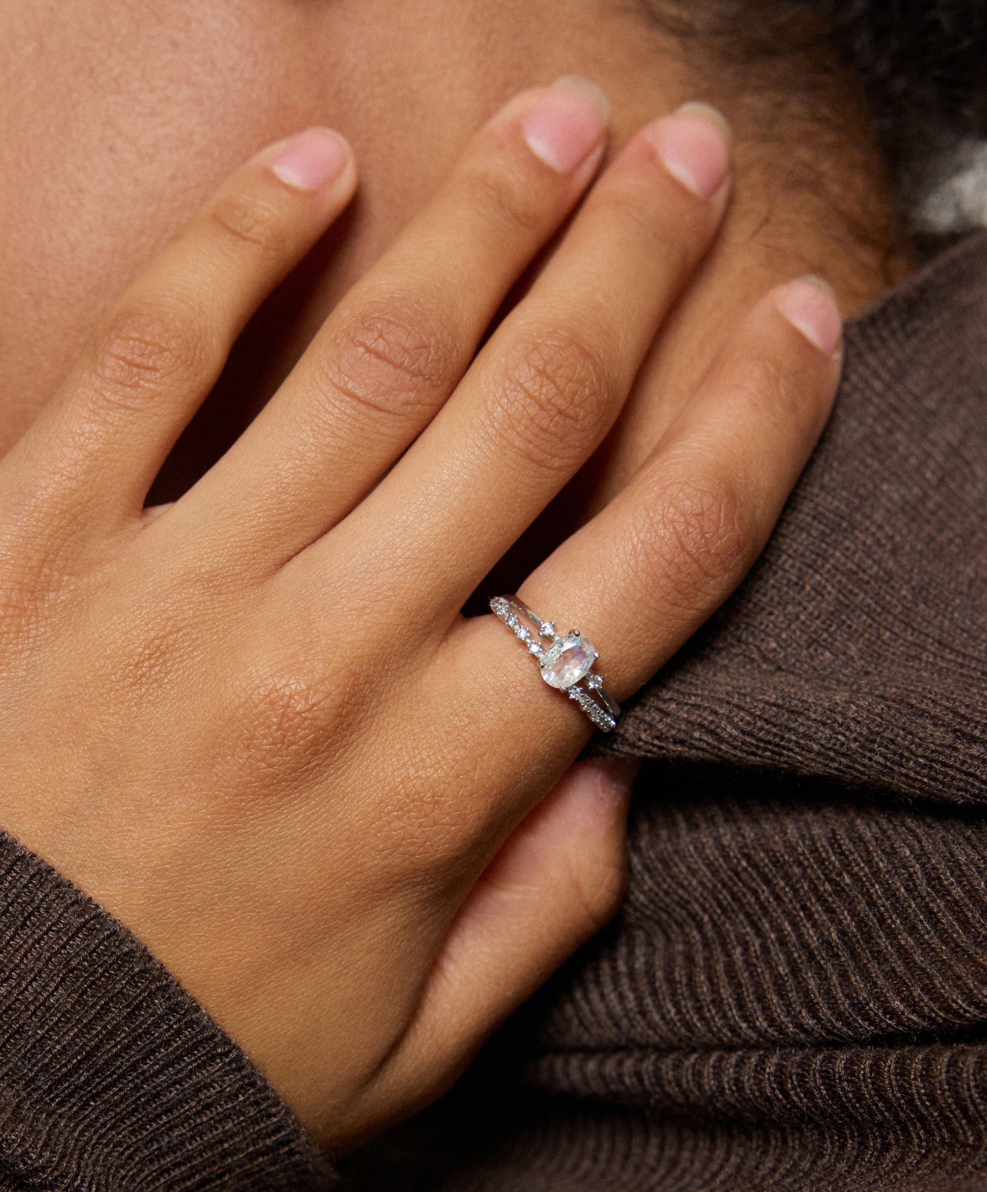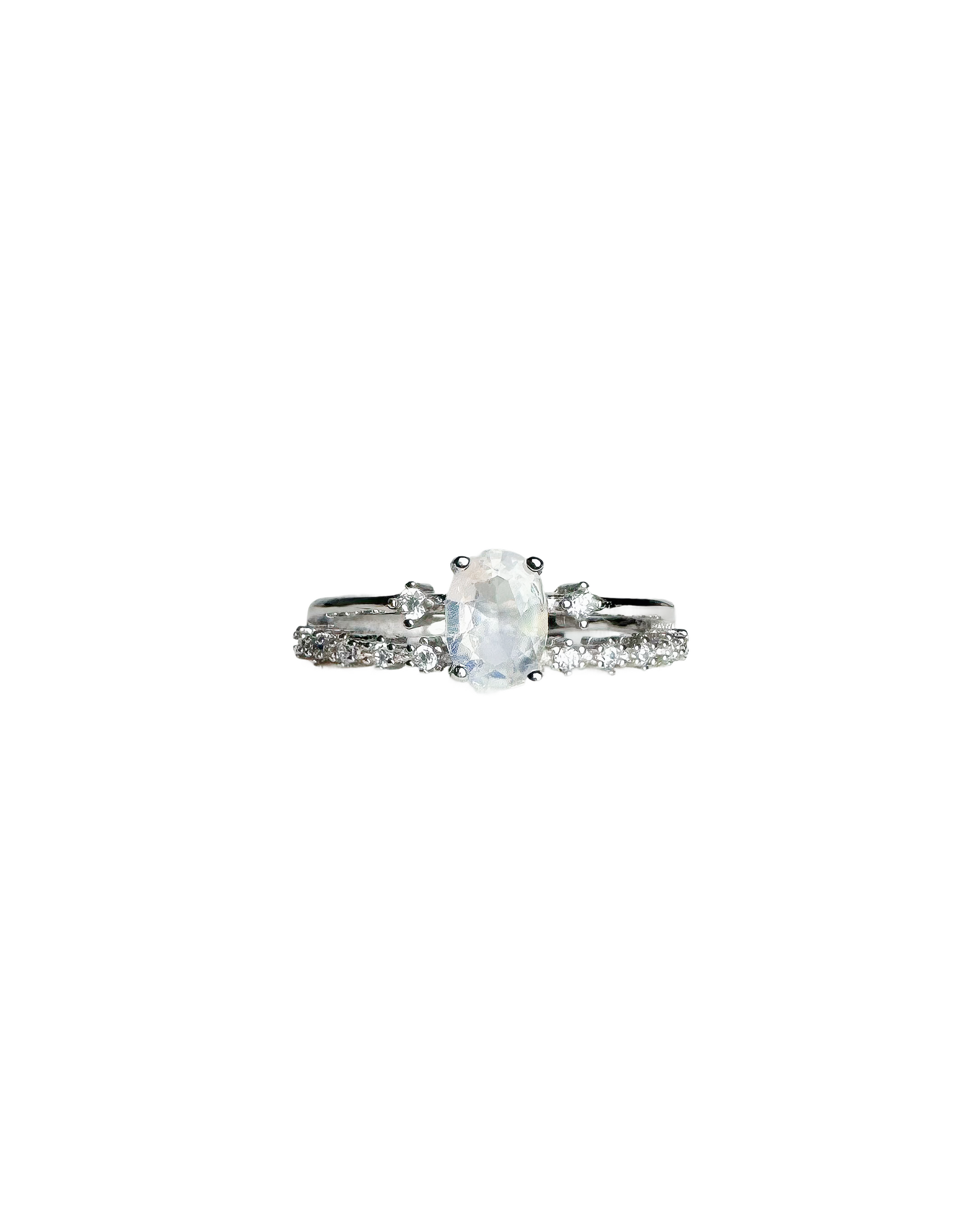 A luminous statement of modern elegance. Featuring a natural rainbow moonstone from Madagascar, this oval-cut gem reveals a soft play of color from certain angles. A fine line of cubic zirconia forms a delicate accent beneath the main stone, creating the illusion of a double band. Effortlessly refined — a piece that glows with quiet sophistication.