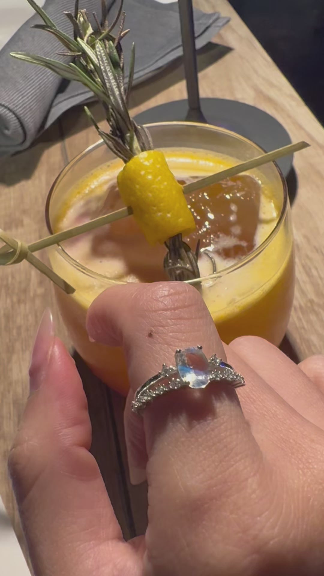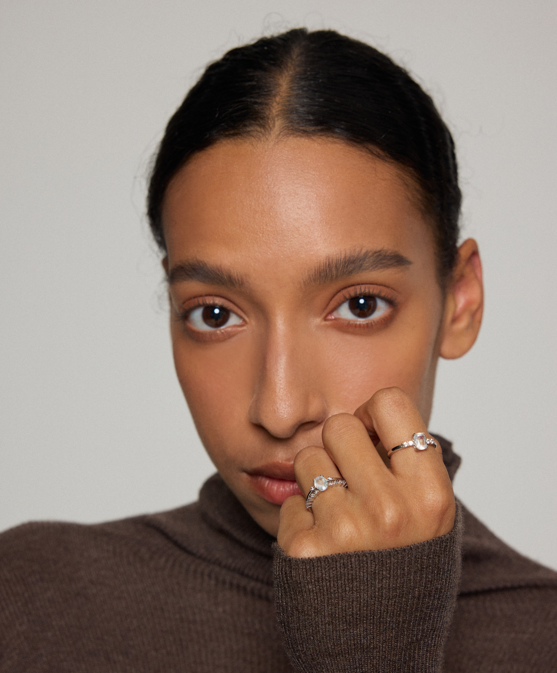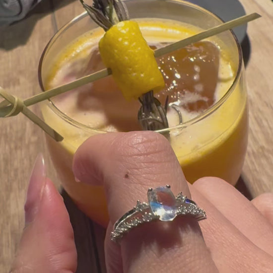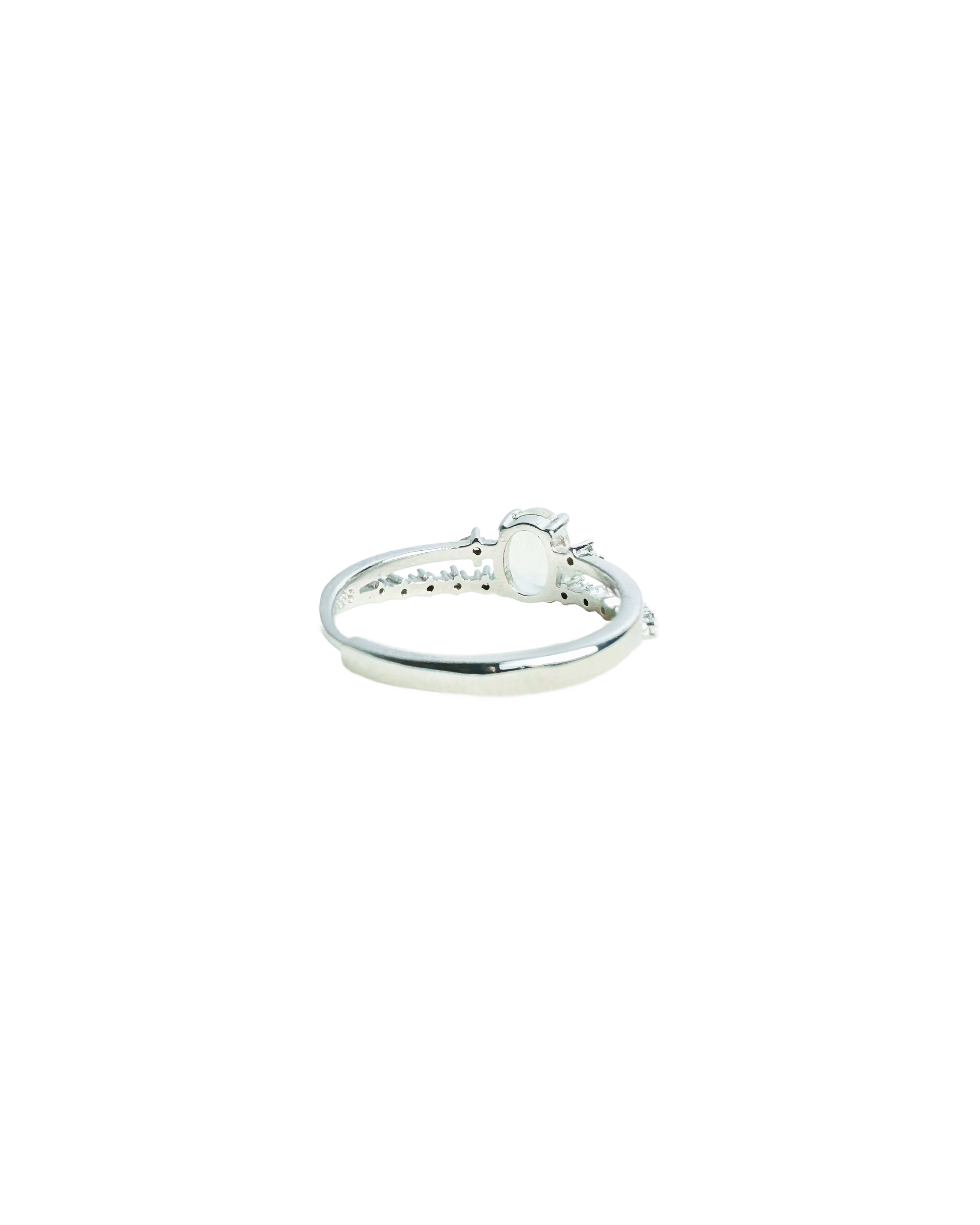 A luminous statement of modern elegance. Featuring a natural rainbow moonstone from Madagascar, this oval-cut gem reveals a soft play of color from certain angles. A fine line of cubic zirconia forms a delicate accent beneath the main stone, creating the illusion of a double band. Effortlessly refined — a piece that glows with quiet sophistication.